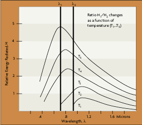is lost when you're measuring small differences in large signals). The ratio technique may eliminate, or reduce, errors in temperature measurement caused by changes in emissivity, surface finish, and energy absorbing materials, such as water vapor, between the thermometer and the target. These dynamic changes must be seen identically by the detector at the two wavelengths being used.
